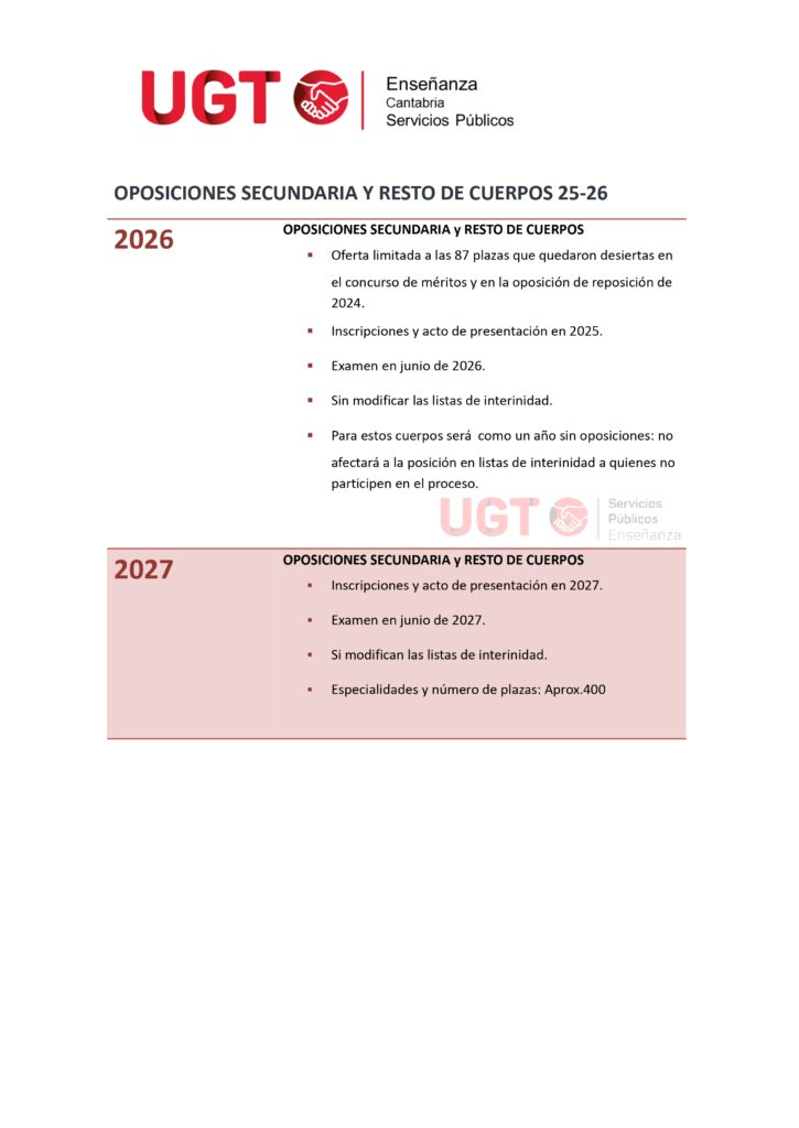 Resumen de las oposiciones de Secundaria y Resto de Cuerpos en Cantabria de 2025 a 2027.